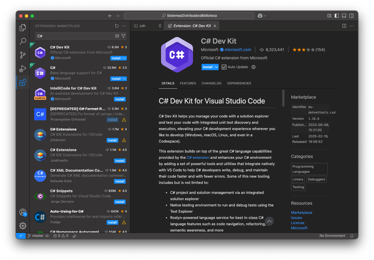 Algumas opções aparecerão. Instale a extensão C# DevKit.