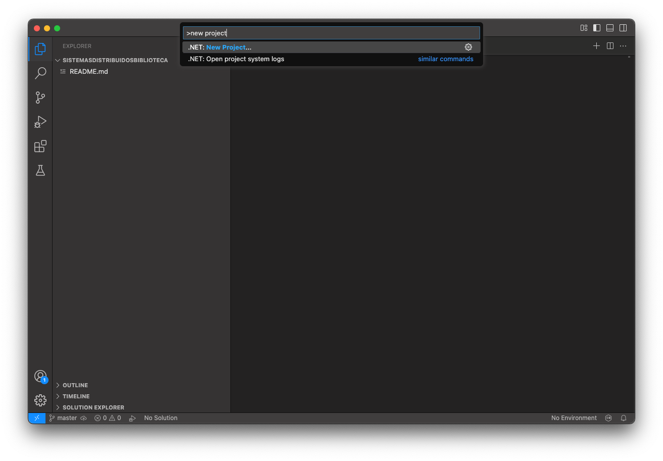 A extensão do C# DevKit adiciona alguns comandos, incluindo um comando para a criação de projetos (tal como fizemos via terminal na seção anterior). Escreva new project para