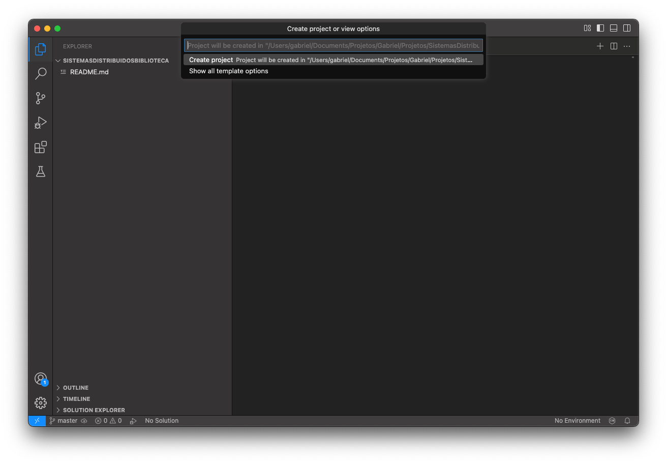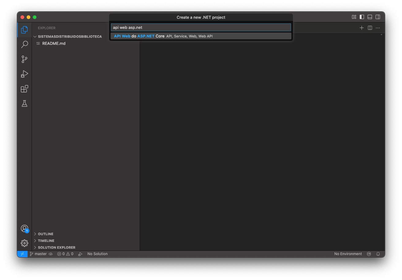 Vamos criar o projeto para a API da nossa biblioteca. Na seção Breve introdução ao Visual Studio Code, fizemos isso utilizando o terminal, apenas para testarmos se a instalação do .NET estava correta. Agora, vamos utilizar a extensão do C# para o VSCode para criar um novo projeto.