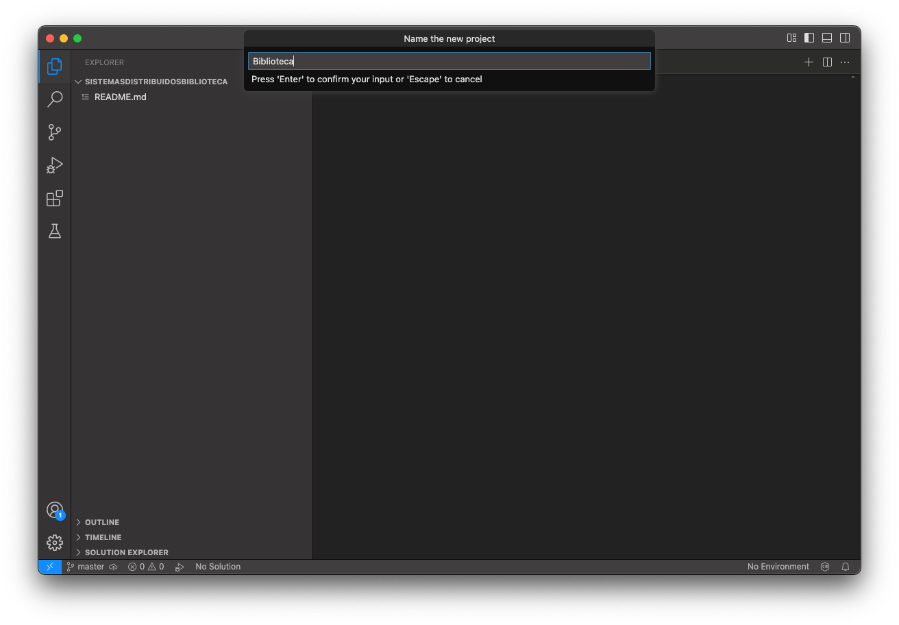 Em seguida, será pedido o nome do projeto. Escreva "Biblioteca", e aperte Enter para prosseguir.