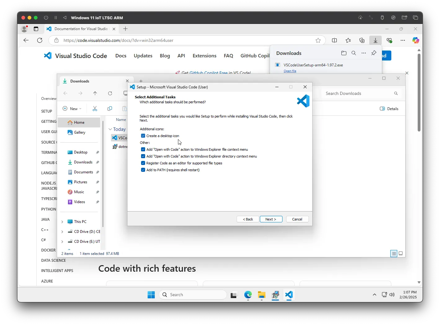 Em seguida, deixe todas as caixas selecionadas. Desta forma, será criado um atalho na sua área de trabalho para abrir o VSCode, além de você poder abrir diretórios específicos no editor através da área de contexto do Windows (quando você clica com o botão direito no explorador de arquivos). Clique em Próximo.