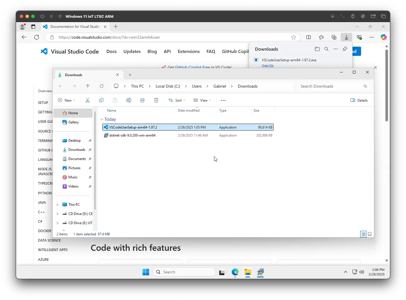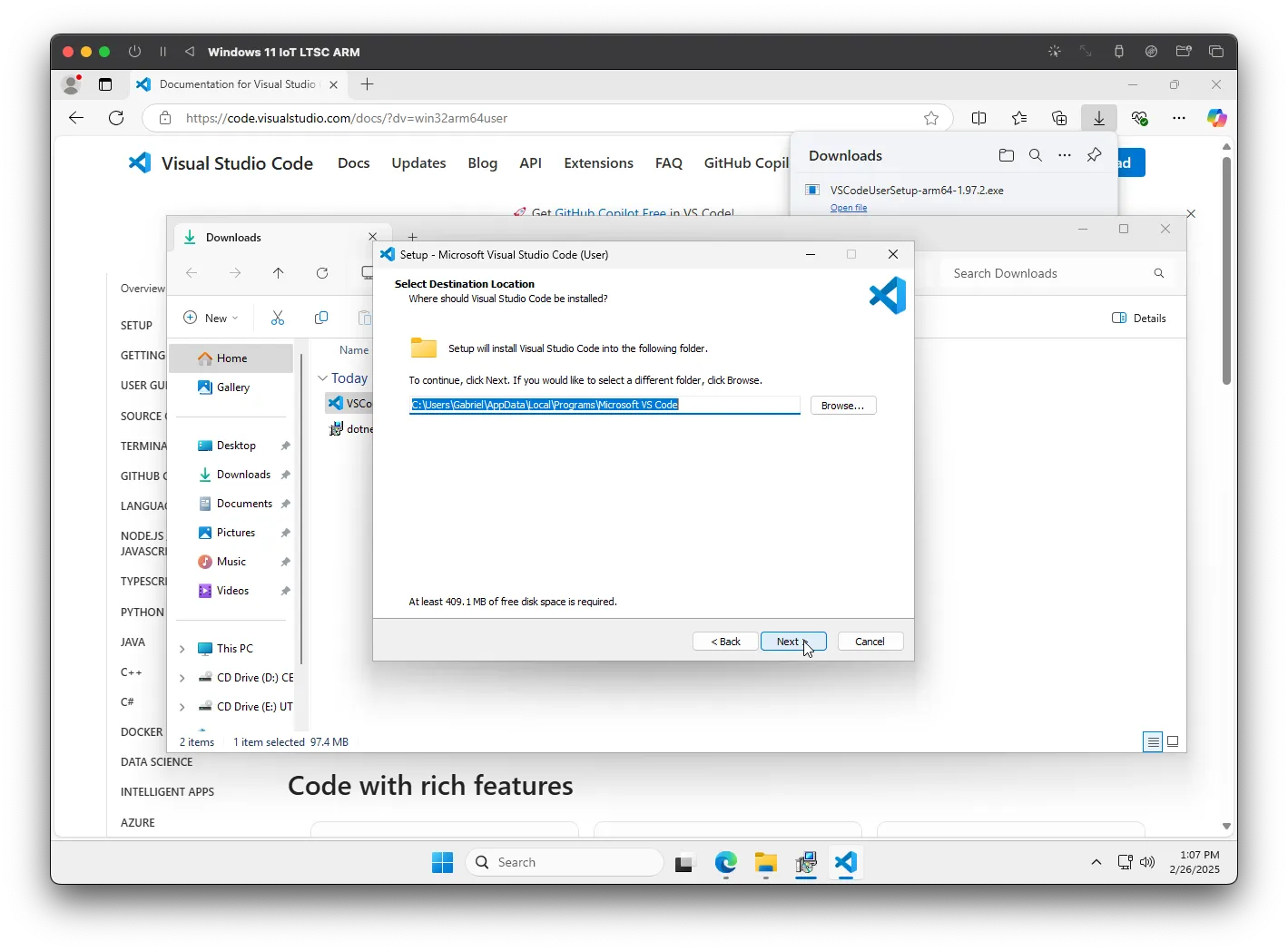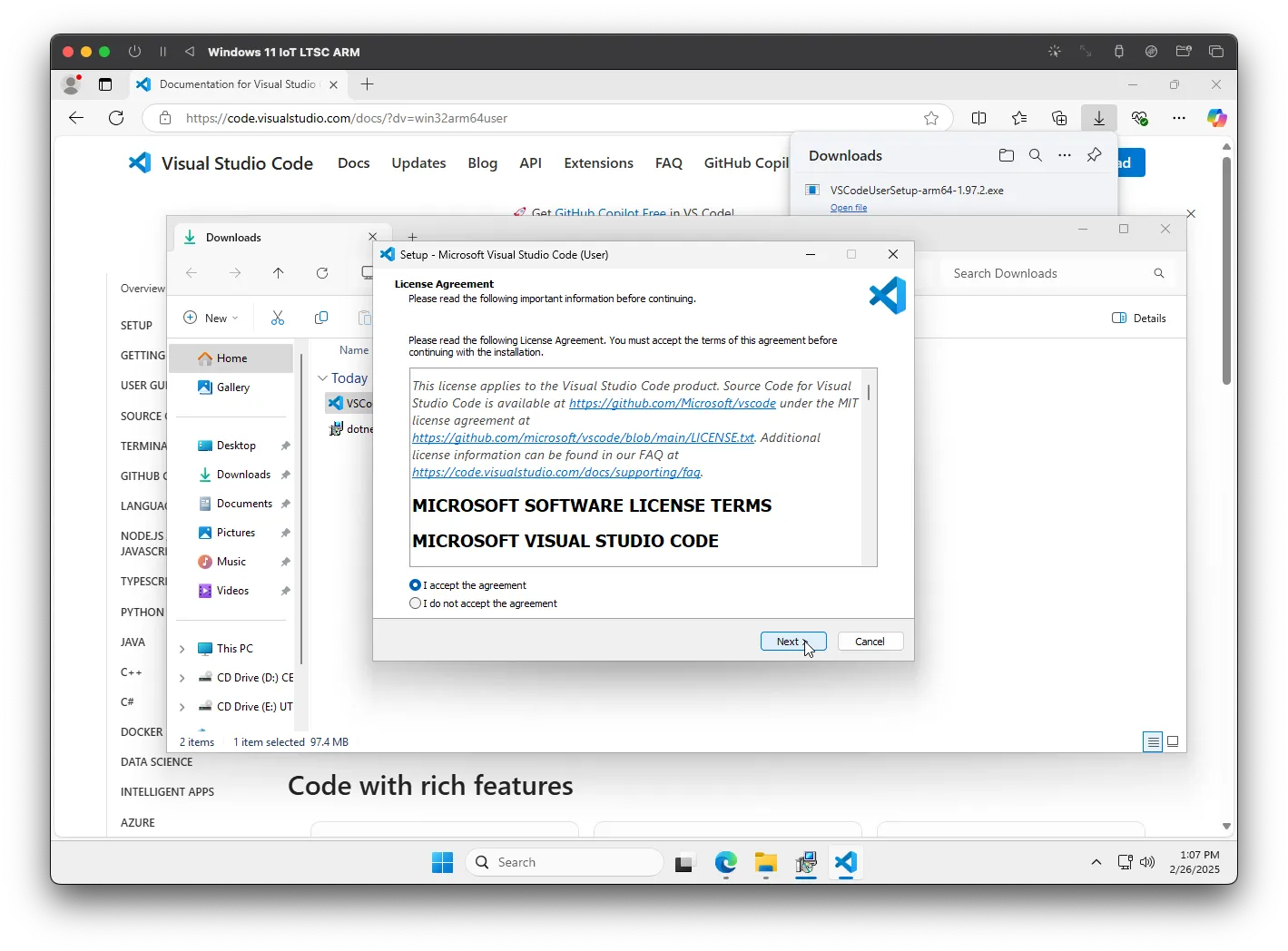 Vá para a página de download do Visual Studio Code e clique em "Baixar para o Windows". Assim como na SDK, o download deve iniciar automaticamente. Abra o executável e comece o processo de instalação.