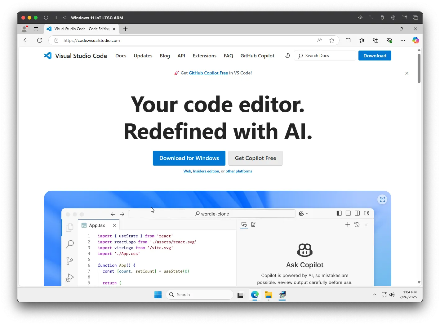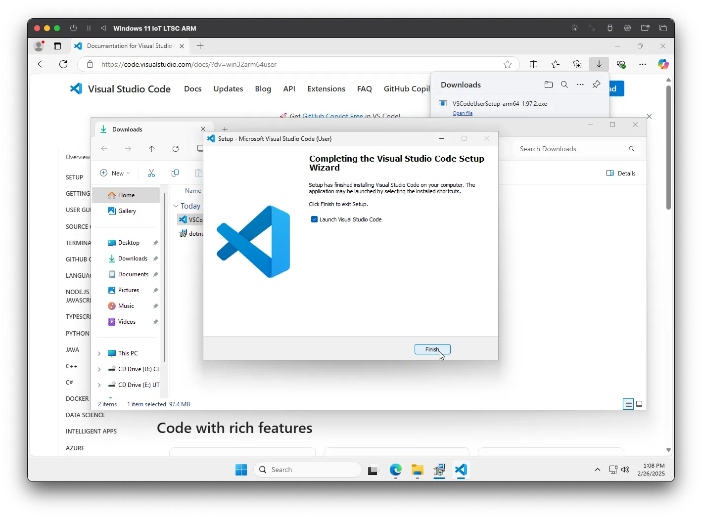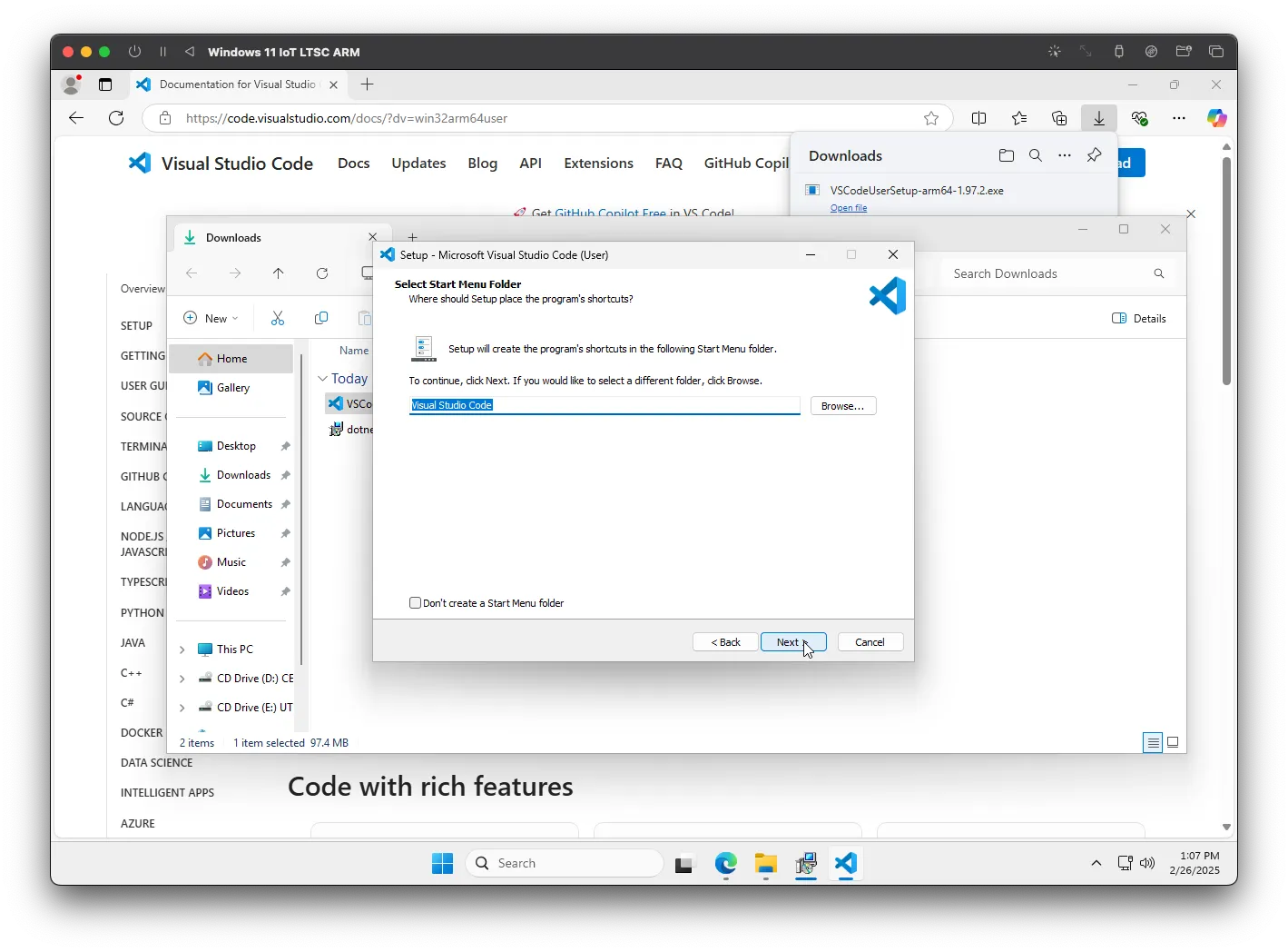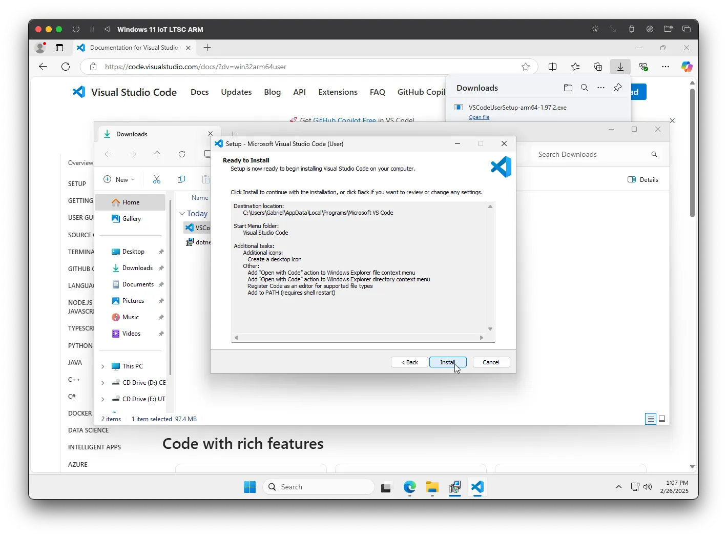 Vá para a página de download do Visual Studio Code e clique em "Baixar para o Windows". Assim como na SDK, o download deve iniciar automaticamente. Abra o executável e comece o processo de instalação.